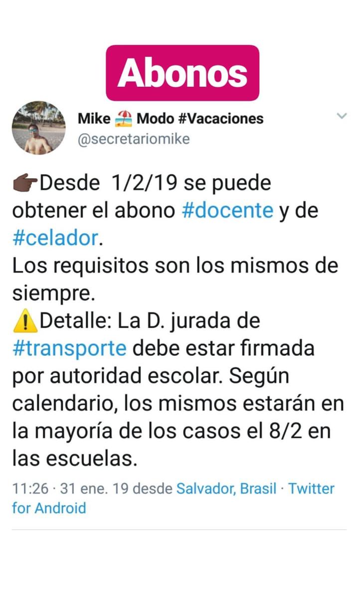 La Secretaría de Servicios Públicos de Mendoza ha informado la extensión de pases gratuitos de docentes y celadores del transporte urbano, media y larga distancia, a partir del 01 de febrero de 2019.