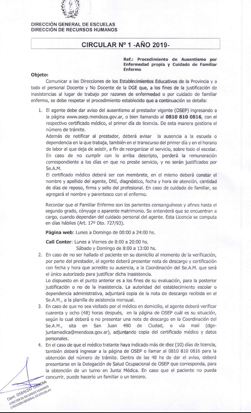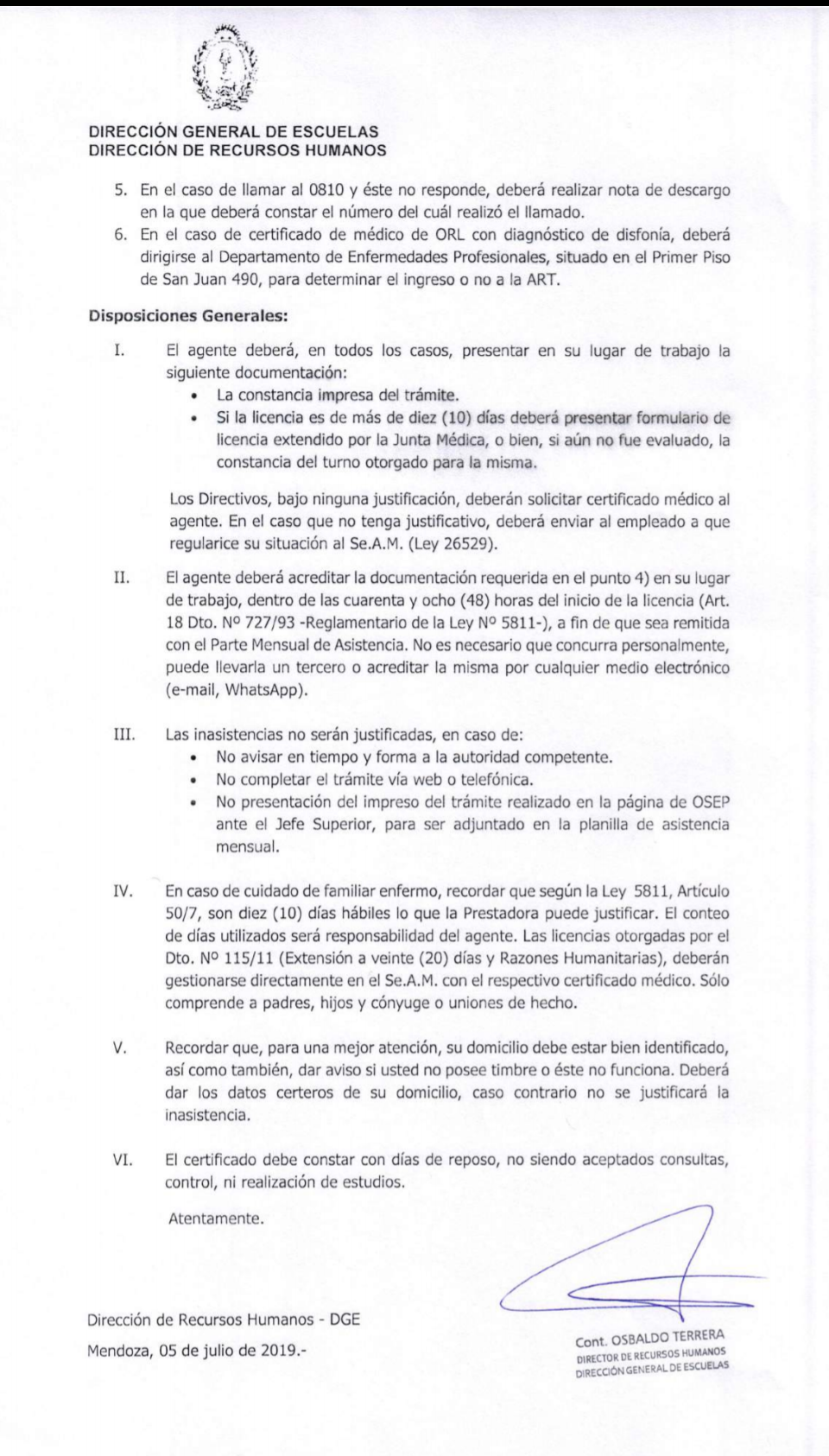 En el mes de julio del corriente la Dirección de Recursos Humanos de la Dirección General de Escuelas emitió una circular en donde detalló todos los pasos a seguir para justificar inasistencias por enfermedad y cuidado de familiar enfermo.