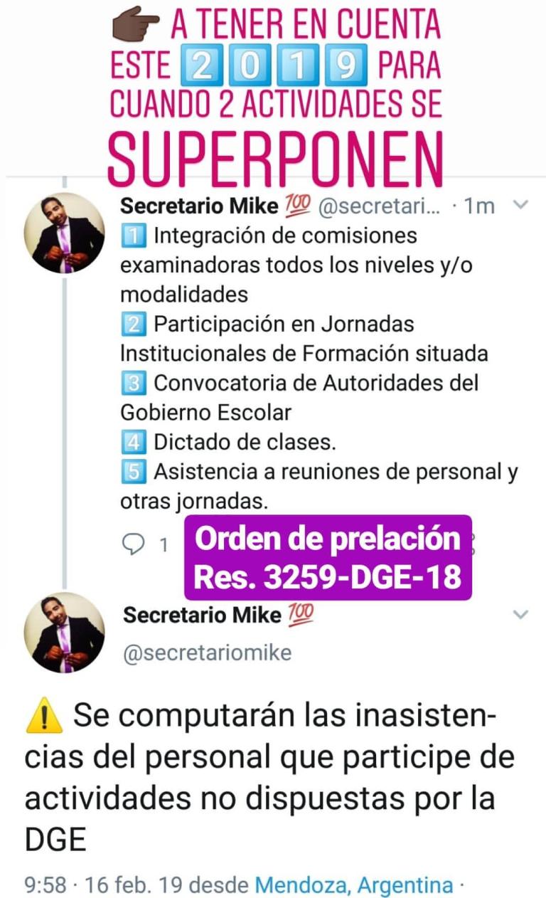 En el caso de que algún docente se vea afectado a cumplir con esta tarea y por ende se superponga con otra actividad dispuesta por la DGE, de manera simultanea (acorde a la declaración jurada e horas y cargos) se tendrá en cuenta el orden de prelación establecido por la Resolución 3259-DGE-18, a saber en primer lugar: Integración de comisiones examinadoras de todos los Niveles y Modalidades.