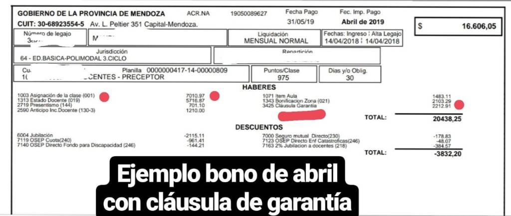 En base a lo explicado aquellos que en el periodo 1 de abril de 2019 al 31 de julio de 2019 percibieron el ítem «clausula de garantía» en sus haberes (revisar los bonos de sueldo) sufrieron los descuentos respectivos en el retroactivo de zona que fue depositado el 25 de septiembre.