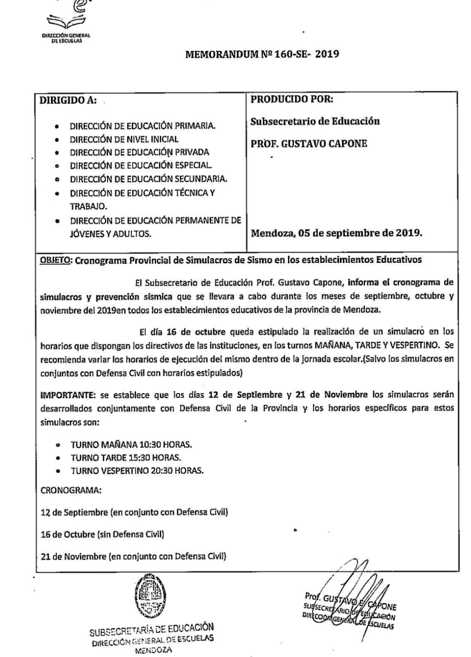 En base al cronograma anunciado oportunamente por la Subsecretaría de Educación (Memorándum 160SE19), os simulacros de sismo se desarrollarán en conjunto con Defensa Civil de la Provincia y los horarios específicos para los mismos son: