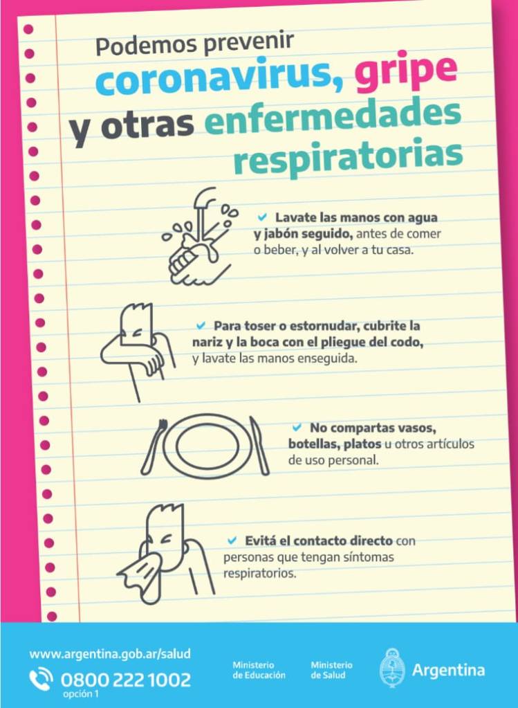 El Ministerio de Educación de la Nación de acuerdo a los lineamientos del Ministerio de Salud de la Nación, está distribuyendo a todas las escuelas y universidades del país, materiales gráficos que incluyen medidas de sanidad e higiene, para la prevención de las enfermedades virales como el coronavirus y también, el dengue y el sarampión.