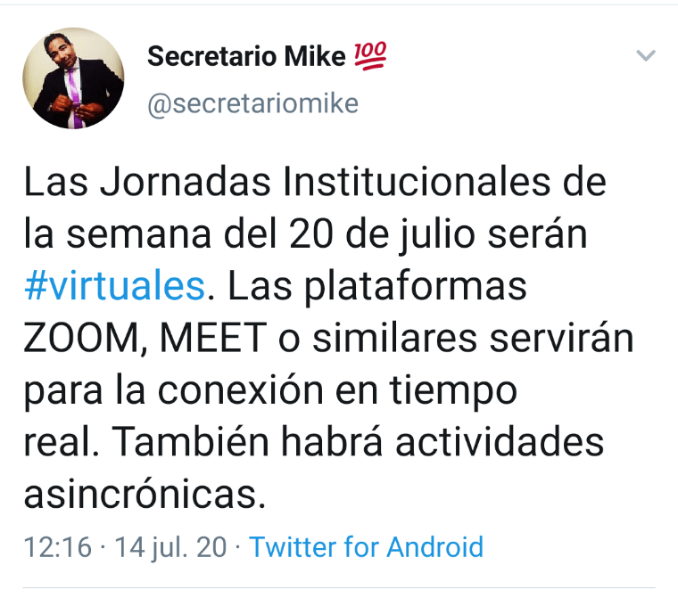 Las Escuelas deberán informar el horario en que se desarrollarán las actividades de cada día de jornadas. En este sentido tal como ocurría en las jornadas presenciales, cuando un agente trabaja en dos o más escuelas, puede que se le superponga la misma jornada cuando se trate de las actividades sincrónicas (en tiempo real por videoconferencia) en este caso el docente en cuestión y las instituciones deberán seguir el criterio de prioridad de asistencia a jornadas institucionales (En donde el agente sea titular, sea coordinador de área, posea mayor carga horaria) A tal fin las direcciones de linea seguramente repasarán el criterio a tener en cuenta en este contexto.