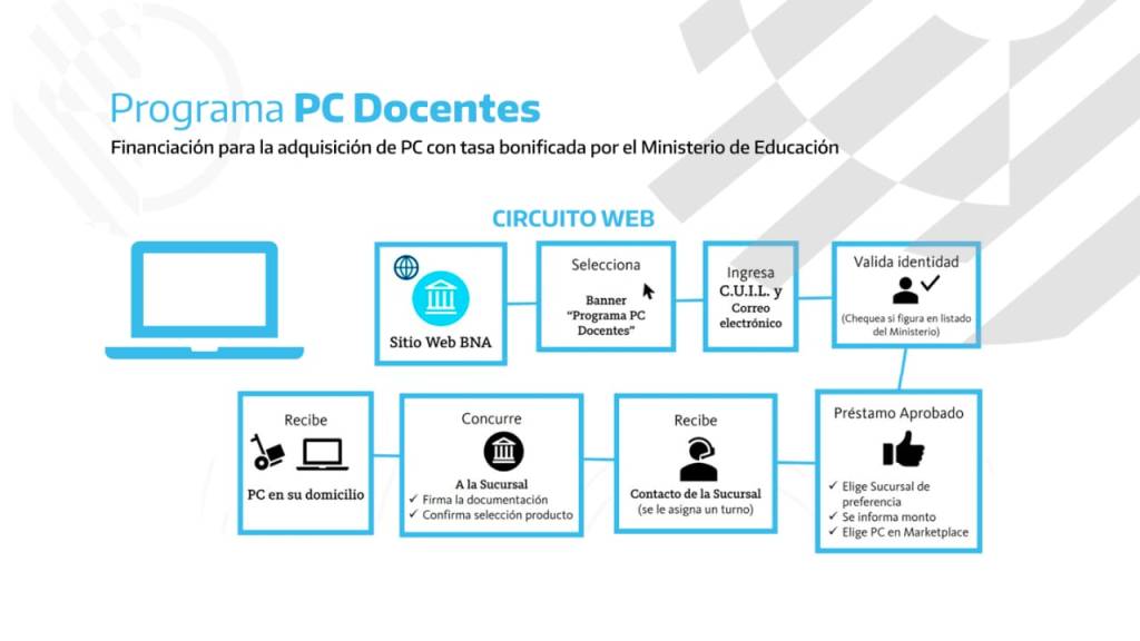 El trámite se inicia en la web de la entidad, http://www.bna.com.ar. Una vez que accede a la página, deberá seleccionar el banner “Programa PC Docentes”,ingresar el CUIL y el correo electrónico y posteriormente se procederá a la validación de la identidad. Cumplidos los requisitos solicitados, se aprobará el préstamo; se informará el monto y deberá elegir la sucursal de preferencia donde continuar la gestión. Además, desde el sitio web, le mostrará el MarketPlace para seleccionar la computadora o equipamiento informático de su preferencia.