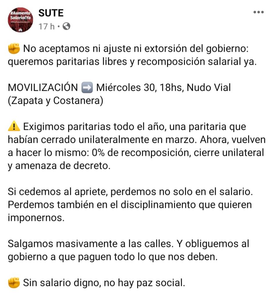 Por otra parte desde una cuenta de Ate Educación a través del sitio change.org, junta firmas para solicitar que ATE MENDOZA, interceda «para hacer las gestiones y negociaciones correspondientes, frente al gobierno provincial y acepte la propuesta salarial del gobierno, emitida oportunamente» según dice la publicación.