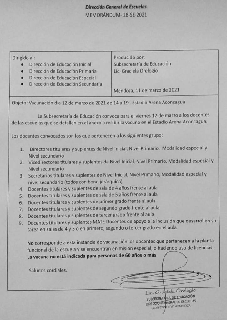 La DGE ha notificado por los memorándums correspondientes, los convocados para este viernes 12 de marzo de 2021 para la aplicación de la vacuna china Sinopharm en el estadio Aconcagua Arenas.