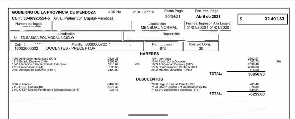 En el blog del Secretario Mike ya hay varios posteos y ejemplos de los diferentes pagos, pero en esta ocasión se pondrá como ejemplo el caso del siguiente bono de sueldo de un cargo de preceptor suplente equiparado, con 2 años de antigüedad, 50% de zona que cobró sus haberes el 30/4/21: