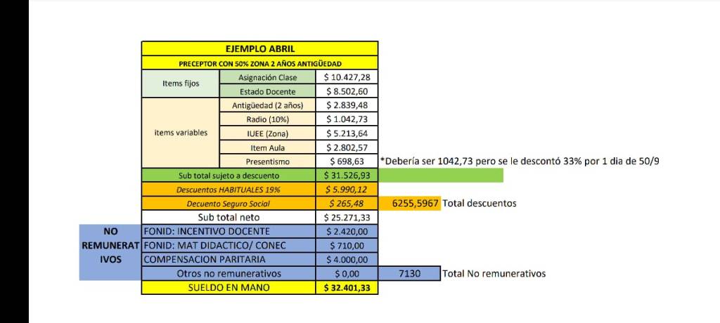 La última cuota extraordinaria de $1210 pesos fue a mediados de mes de marzo (por los servicios prestados en febrero). Sin embargo la Paritaria Nacional estableció que en el mes de abril se debía actualizar el concepto de incentivo docente a $2420 por cargo. En base a lo ocurrido en Mendoza, en vez de pagar $1210 a mediados de abril y otros $1210 a fin de abril junto al sueldo, finalmente se pagó todo junto en un solo ítem en los haberes mensuales por $2420 para cada cargo docente ó 15 horas cátedras.
