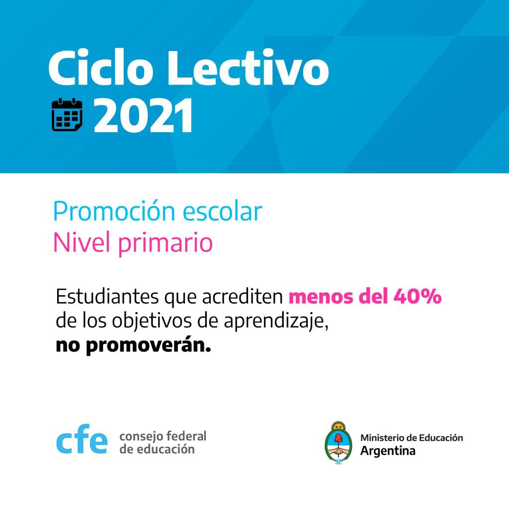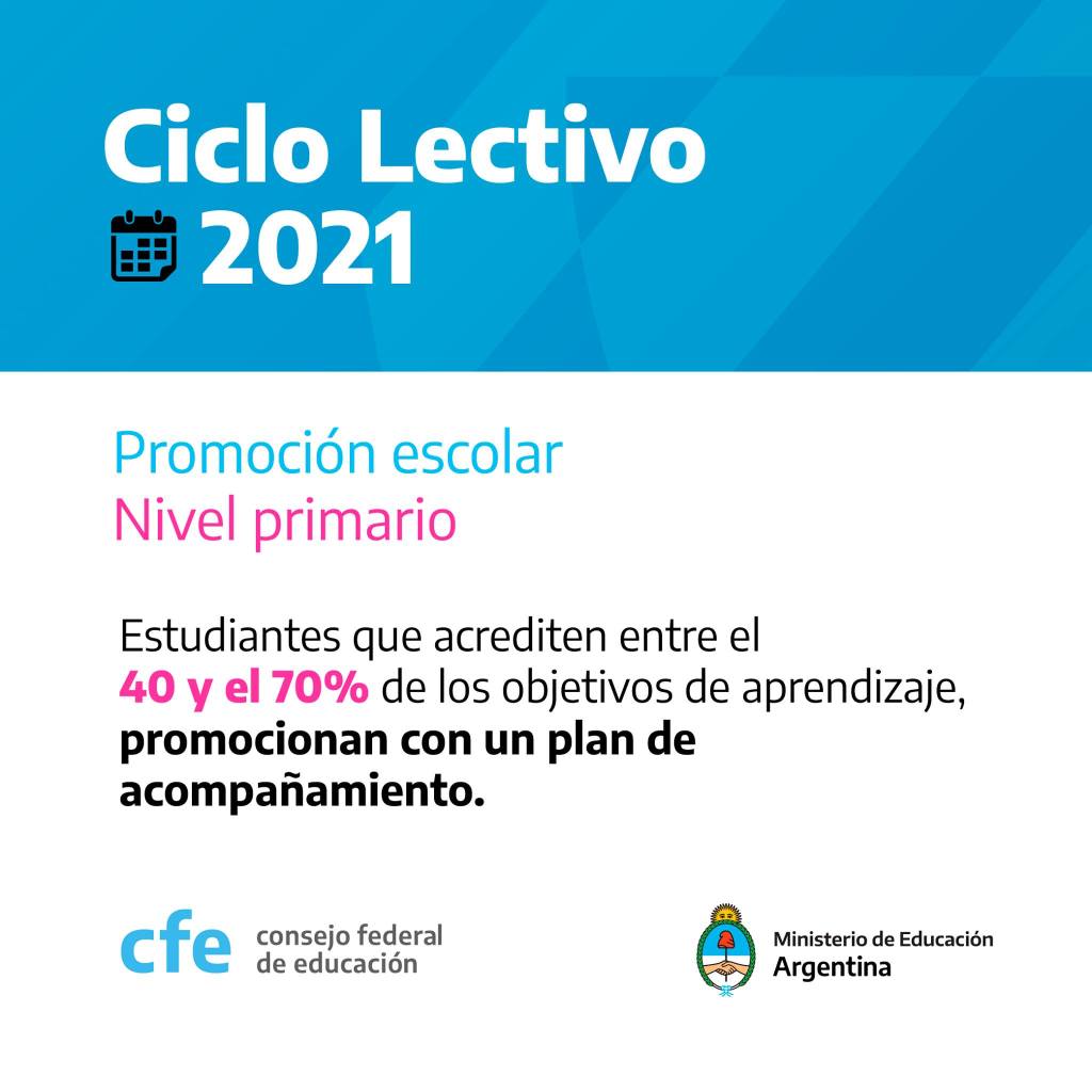Quienes al cierre del ciclo lectivo 2021 hayan logrado acreditar entre el 40% y el 70% de los objetivos de aprendizaje, promocionarán de manera acompañada y contarán con un plan de actividades compartido entre el docente del grado que deja y el docente del grado al que accede. Finalmente, quienes al momento de la finalización del ciclo lectivo 2021 alcancen una acreditación menor al 40% no promoverán.