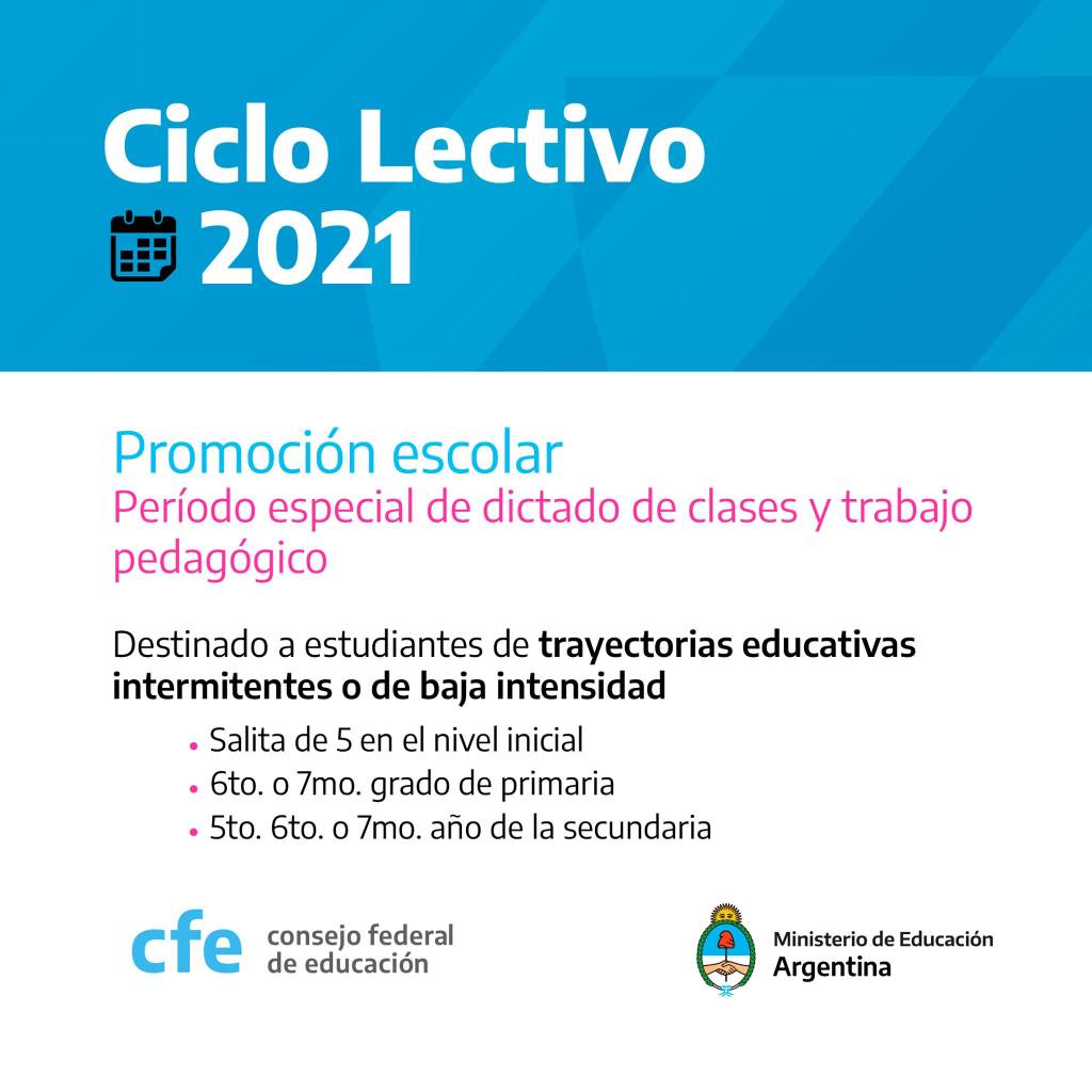 Además, se aprobó un período especial de dictado de clases y de trabajo pedagógico para quienes hayan tenido trayectorias intermitentes o de baja intensidad. El mismo se llevará adelante en febrero 2022 con las y los estudiantes que terminan salita de 5 en el nivel inicial; 6to. o 7mo. grado de primaria; o 5to. 6to. ó 7mo. año de la secundaria.