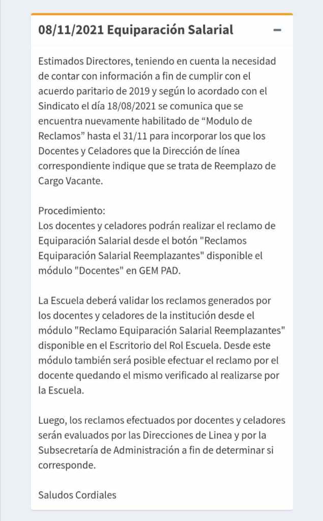 La DGE ha informado que se encuentra habilitado en el sistema GEM, el módulo para reclamos de agentes suplentes que deben ser “equiparados” según la normativa vigente. Los reclamos por parte del agente y validación por parte de los directivos será durante el mes de noviembre.