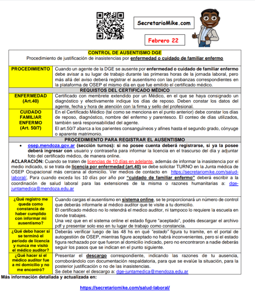 Para más detalles sobre formularios, descargos y otros tramites relacionados con licencias por enfermad, cuidad de familiar enfermo fuera de la provincia, etc ver la sección «CONTROL DE AUSENTISMO» del secretario Mike