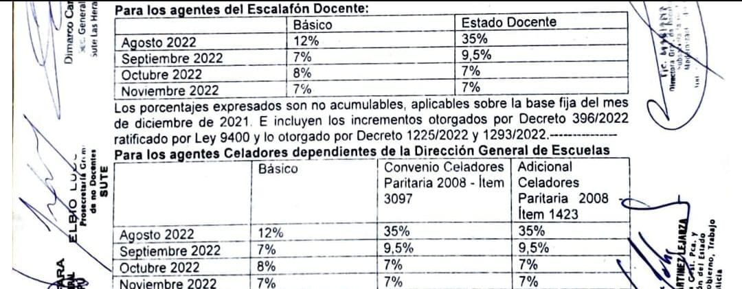 Por estos días se llevan a cabo las paritarias con los diferentes gremios estatales y al día de hoy han aceptado la propuesta del ejecutivo: Ampros; Tribunal de Cuentas; Vialidad; y Fiscalía de Estado. Mientras que ATE ya rechazó la propuesta y en consecuencia el Gobierno anticipó que ante el rechazo no habrá nuevo aumento.