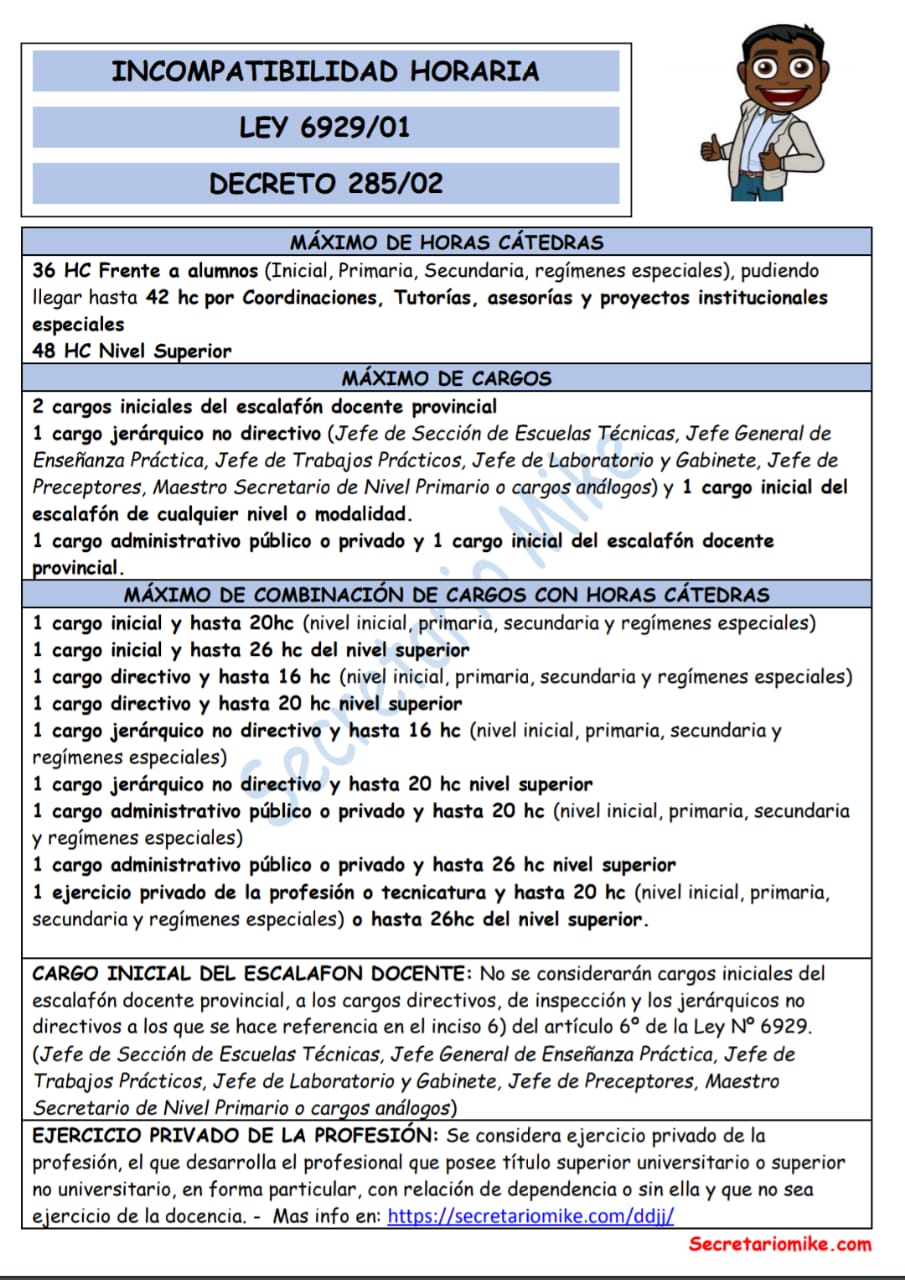 En Mendoza la ley 6929/01 y el Decreto reglamentario 285/02 definen los criterios de incompatibilidad horaria del docente. A continuación se ofrece una imagen que sintetiza la web de Secretario Mike: