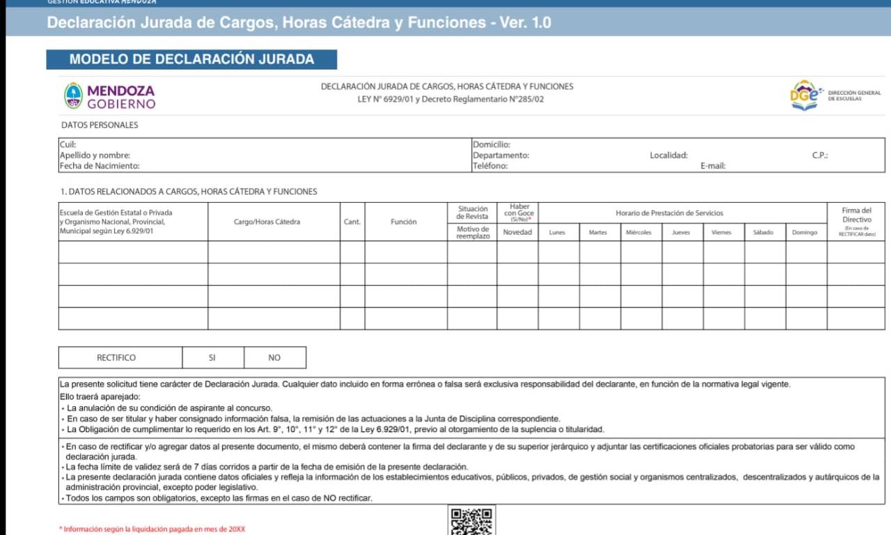 La situación de revista del docente queda expuesta con la «declaración jurada de horas y cargos» (DDJJ), en donde debe reflejarse la situación real del agente.