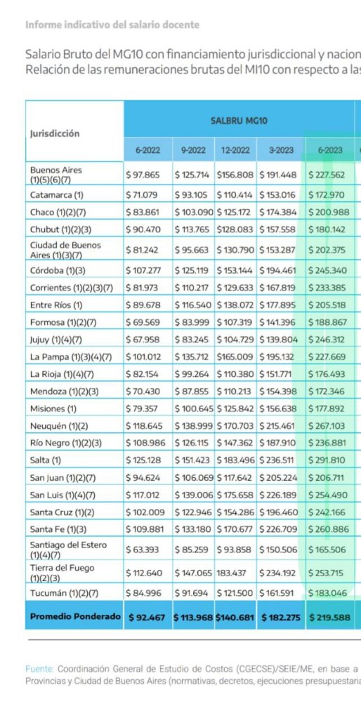 La Coordinación General de Estudio de Costos del Sistema Educativo, dependiente del ministerio de Educación de la Nación publicó el informe trimestral que llega con los datos hasta el mes de junio de 2023 y en el mismo se puede ver asimetrías del salario docente por jornada simple en cargos con 10 años de antigüedad.