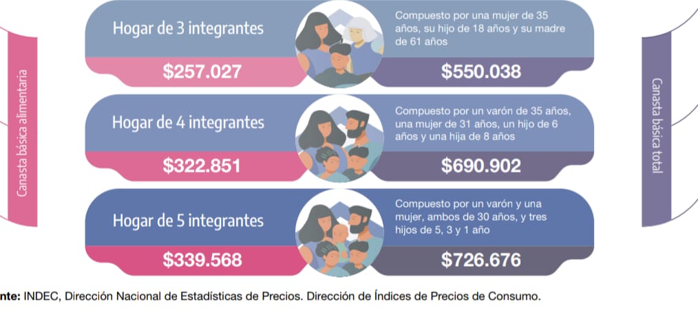Según el INDEC, para el informe del 12 de marzo de 2024 una familia tipo (de 4 personas: compuesta por un varón de 35 años, una mujer de 31 años, un hijo de 6 años y una hija de 8 años) necesita $690.902 pesos para cubrir las necesidades básicas del mes, es decir que se trata prácticamente de 700 mil pesos.