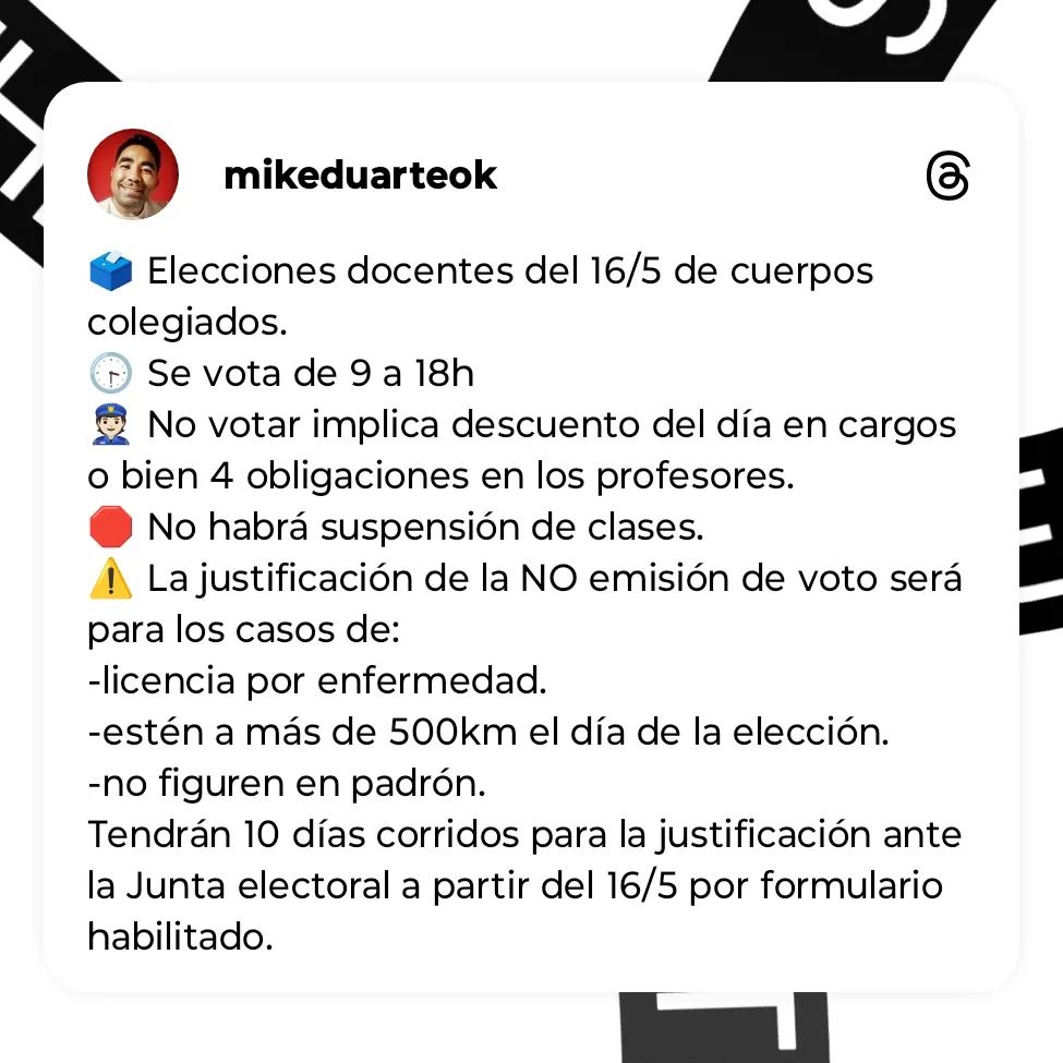 El jueves 16 de mayo habrá elecciones de cuerpos colegiados en más de mil mesas habilitadas para un padrón de más de 48 mil docentes, para votar a los miembros de Juntas Calificadoras y de Disciplina que pueden ser elegidos por voto directo de los docentes, a diferencia de los otros miembros que son designados por el Gobierno de turno y conducción sindical.