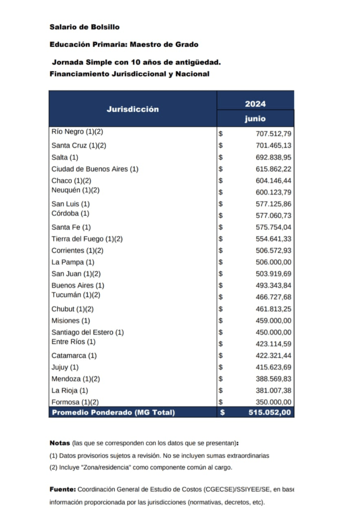 • El salario de bolsillo para un cargo de maestro de grado con 10 años de antigüedad en PROMEDIO en la Argentina fue de $ 515.052 en junio.