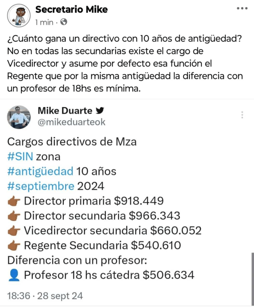 Un cargo directivo de Regente con una antigüedad de 10 años, a septiembre cobra $540.610,14 de bolsillo y un profesor con la misma antigüedad y tan solo 18 horas cátedra semanales en el mismo mes $506.634,30.