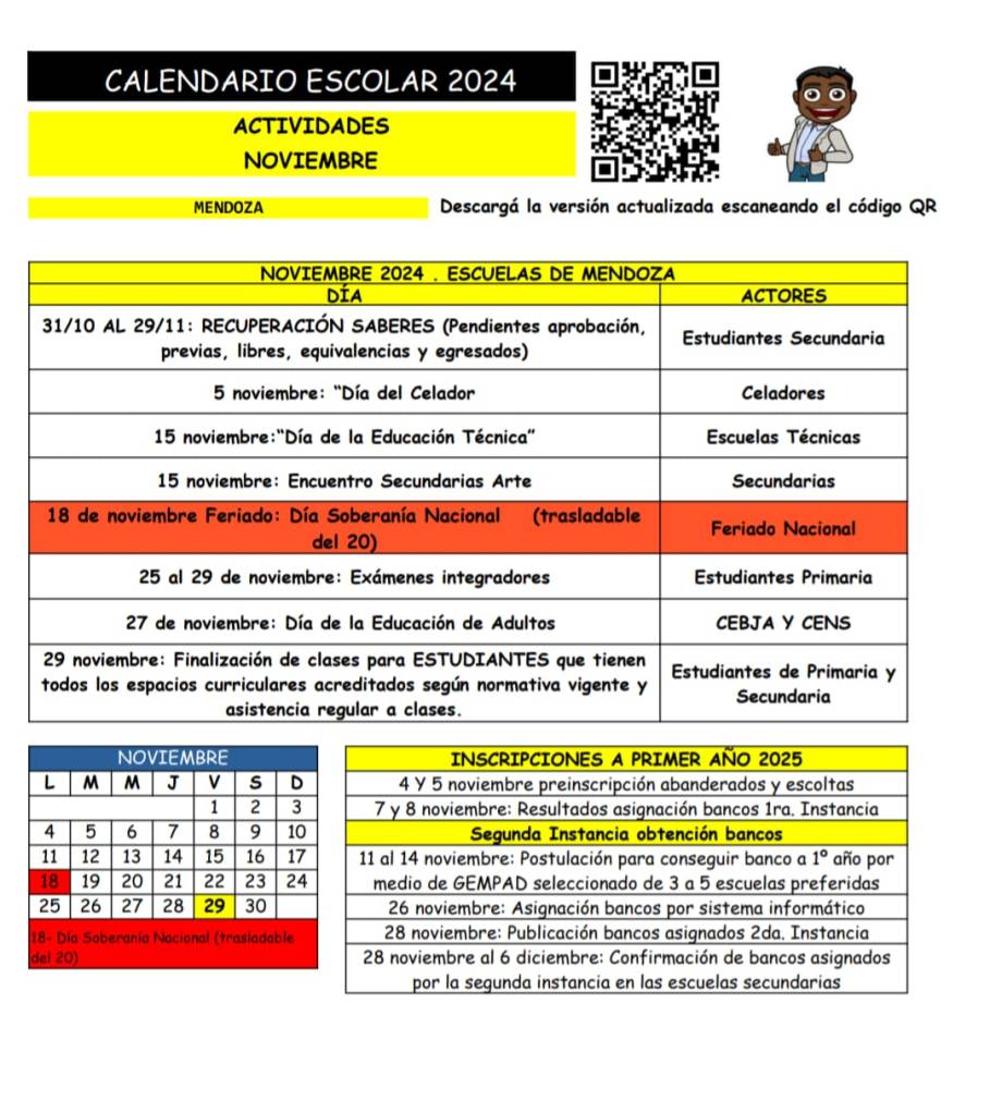 Se comparte el cronograma de actividades dispuestas por el calendario escolar 2024 para el mes de noviembre en las escuelas.