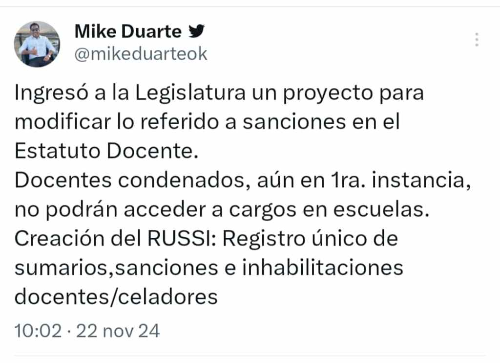 En este sentido el jueves 21 de noviembre de 2024, se le dio ingreso en la Legislatura al proyecto de reforma en el Estatuto Docente, para definir las sanciones en caso de docentes y no docentes condenados por la Justicia y además crear un registro de quienes poseen sanciones, inhabilitaciones.