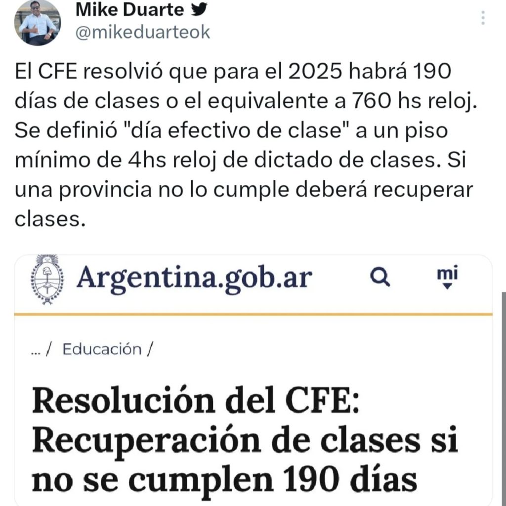 Para el ciclo lectivo 2025 el Consejo Federal de Educación estableció que los calendarios deben ser de 190 días de clase o el equivalente a 760 horas reloj como piso mínimo (tal como venía siendo hasta el momento), pero se sumó –como parte de la estrategia de seguimiento– que frente ante a su incumplimiento, la medida de compensación que debe usarse obligatoriamente es la recuperación efectiva del tiempo de clase. Por otro lado, se determinó la definición de “día efectivo de clase” con un piso mínimo de 4 horas reloj de dictado de clases o el tiempo estipulado según nivel y/o modalidad.