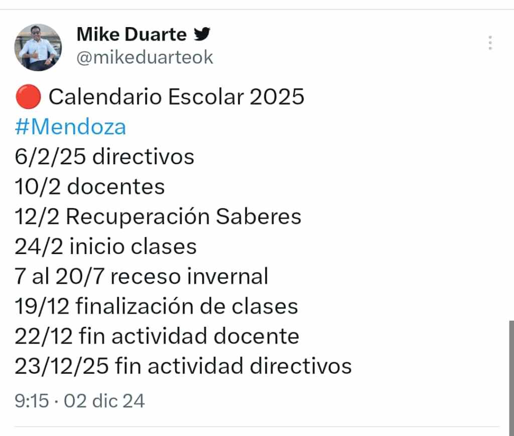En Mendoza las clases inician el lunes 24 de febrero de 2025,pero lo docentes deberán presentarse en las escuelas el lunes 10 de febrero, en tanto que el miércoles 12 de febrero de 2025 deberán presentarse los estudiantes con que deben asistir al período de recuperación de saberes y fortalecimiento de las trayectorias escolares para estudiantes de nivel primario y secundario.