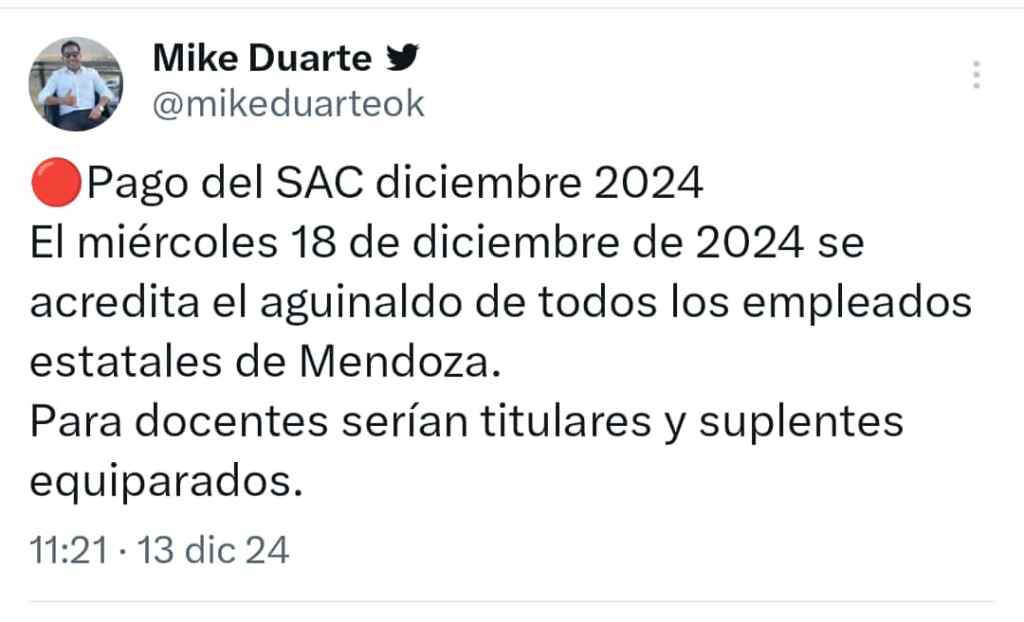 Para los empleados estatales de Mendoza, el pago de aguinaldo será el 18 de diciembre de 2024.