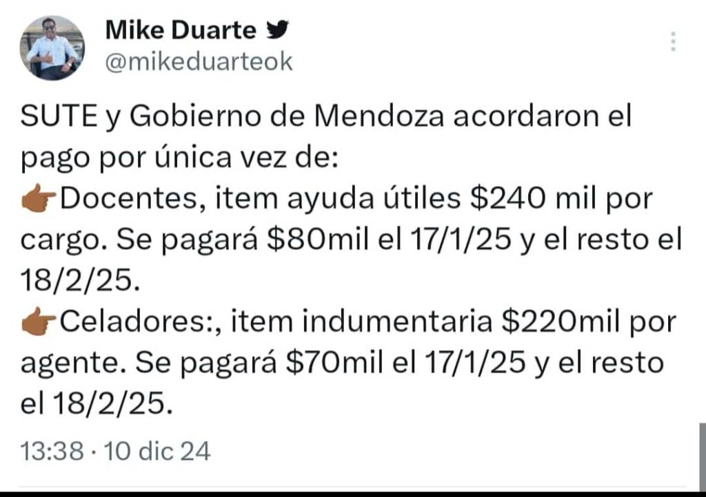 Para los docentes de Mendoza se hará efectivo el pago de $240 mil pesos en concepto del ítem Ayuda de útiles 2025 por única vez. El pago se realizará en 2 partes: 80.000 pesos serán acreditados el día 17 de enero del 2025 y el resto se depositará el 18 de febrero de 2025.