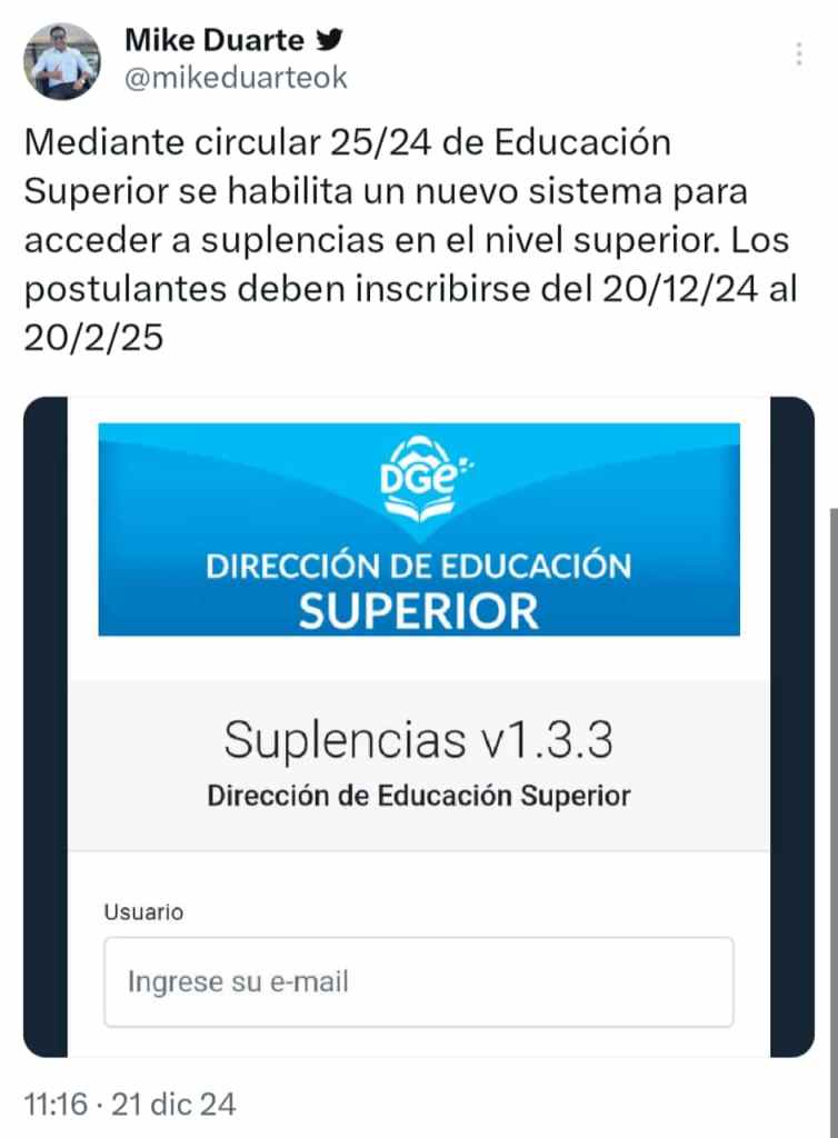 Este sistema único de inscripción para suplencias está habilitado desde el 20 de diciembre del 2024 al 20 de febrero del 2025. Se puede acceder a través del siguiente LINK.