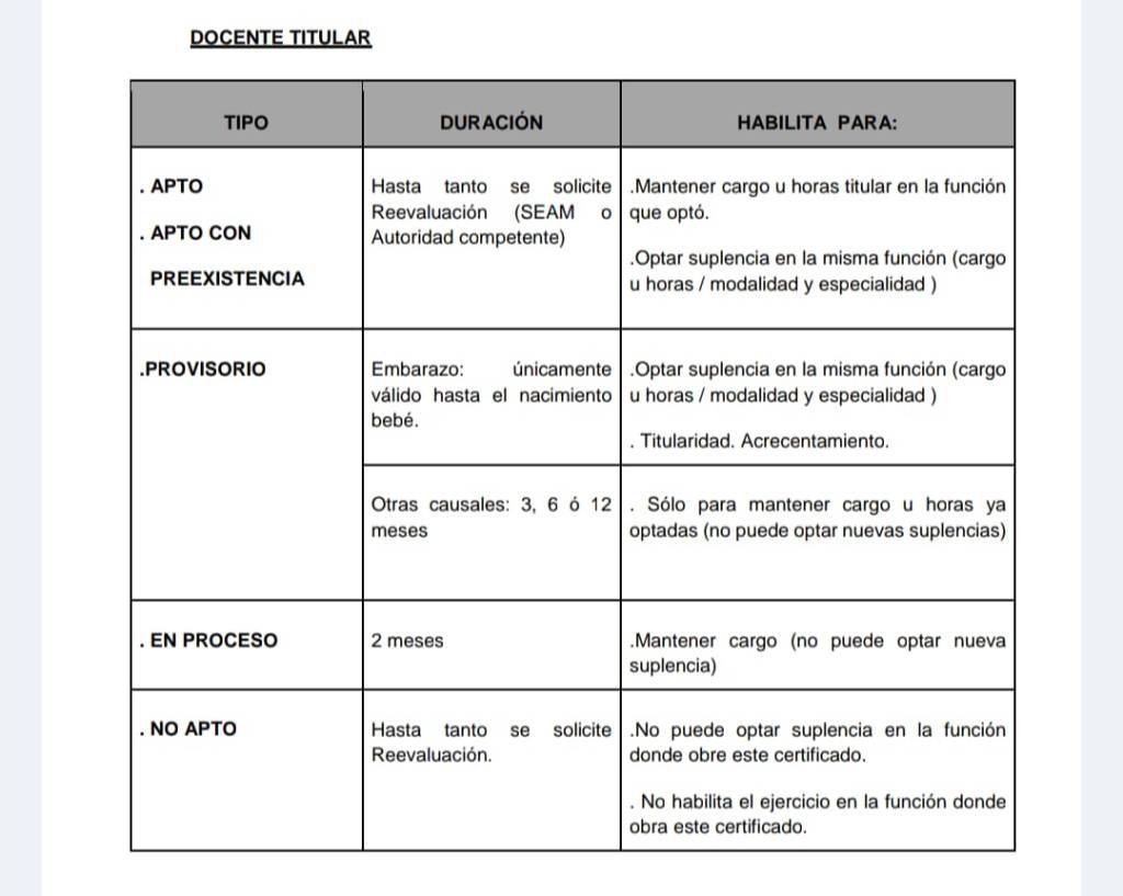 Suplencias en cargos iniciales del escalafón y horas cátedra: el docente que opte por primera vez a una suplencia, podrá presentar POR ÚNICA VEZ, certificado médico expedido por efector público. Obtenida la suplencia deberá iniciar ante el Servicio de Auditoría Médica (SeAM) el trámite previsto a fin de que se le otorgue el código requerido para la realización del certificado de aptitud psicofísica, enviando por mail al correo oficial la documentación solicitada.