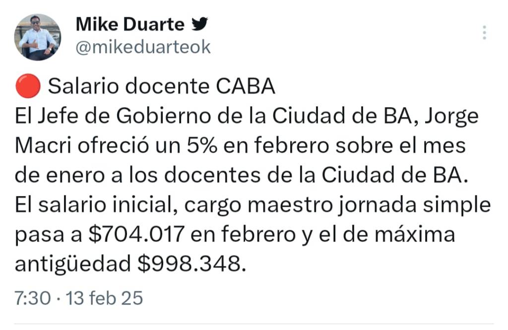 En la Ciudad Autónoma de Buenos Aires, el Jefe de Gobierno, Jorge Macri ofreció un 5% de aumento sobre los salarios de enero y en consecuencia el cargo de maestro de grado Jornada Simple que recién inicia en febrero pasará a cobrar $704.017 pesos, la Jornada Completa $1.408.034 y el cargo de maestro jornada simple con la mayor antigüedad $998.348 .