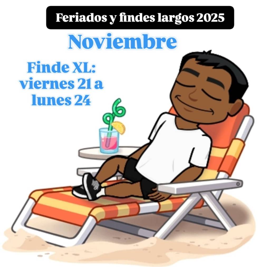 - Viernes 21 al lunes 24 de noviembre finde XLde 4 días: 21 de noviembre no laborable con fines turísticos y el lunes 24/11 es feriado por el Día de la Soberanía Nacional (Se traslada del 20/11).