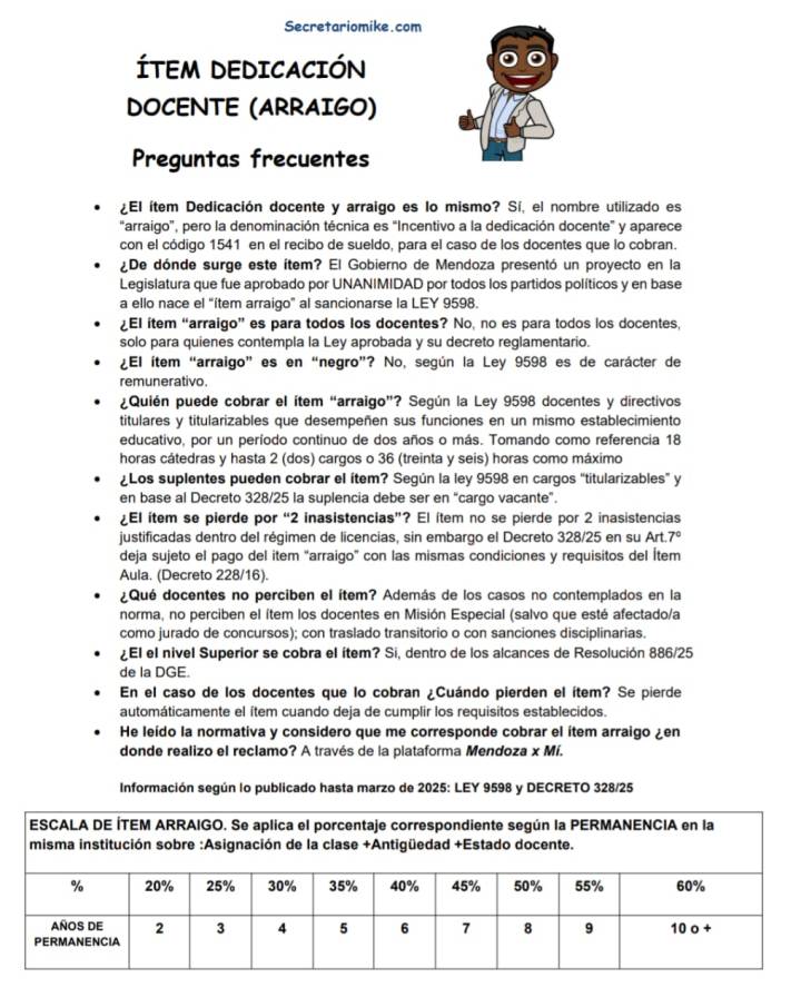 El ítem «arraigo» es un monto remunerativo creado por la LEY 9598 (aprobado por unanimidad en la legislatura) como el incentivo Dedicación Docente, destinado a aquellos docentes y/o directivos titulares y titularizables, que desempeñen sus funciones en un mismo establecimiento educativo, bajo la órbita del Ministerio de Educación, Cultura, Infancias y Dirección General de Escuelas, por un período continuo de dos años o más, para cargos de nivel inicial, primario y secundario en todas sus modalidades, jóvenes y adultos tomando como referencia 18 horas cátedras y su proporcionalidad ascendente y descendente, en todas sus modalidades y hasta 2 (dos) cargos o 36 (treinta y seis) horas como máximo.