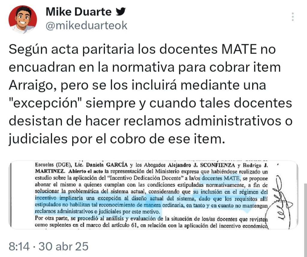 Por lo tanto el Gobierno haría las modificaciones pertinentes siempre que los docentes MATE desistan en hacer reclamos administrativos o judiciales.