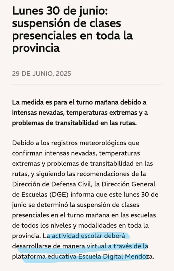 En Mendoza es habitual que se suspendan las clases por Zonda, pero esta vez el frío polar y las nevadas provocaron una situación atípica, donde el Gobierno Escolar decidió suspender las clases en todo el territorio provincial durante lunes y martes.