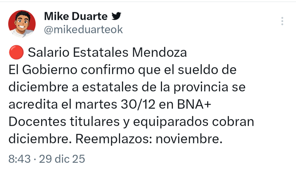 En Mendoza, los haberes del sector estatal provincial se pagan el último día hábil de cada mes. Por lo tanto, el salario al personal educativo estará acreditado en BNA+ el martes 30 de diciembre de 2025.