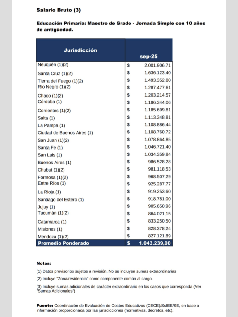 De acuerdo con los datos difundidos por el Ministerio de Capital Humano – Secretaría de Educación de la Nación (con corte a septiembre de 2025), Mendoza se ubica en el puesto 24 a nivel nacional —último lugar— para un cargo testigo de jornada simple con 10 años de antigüedad.