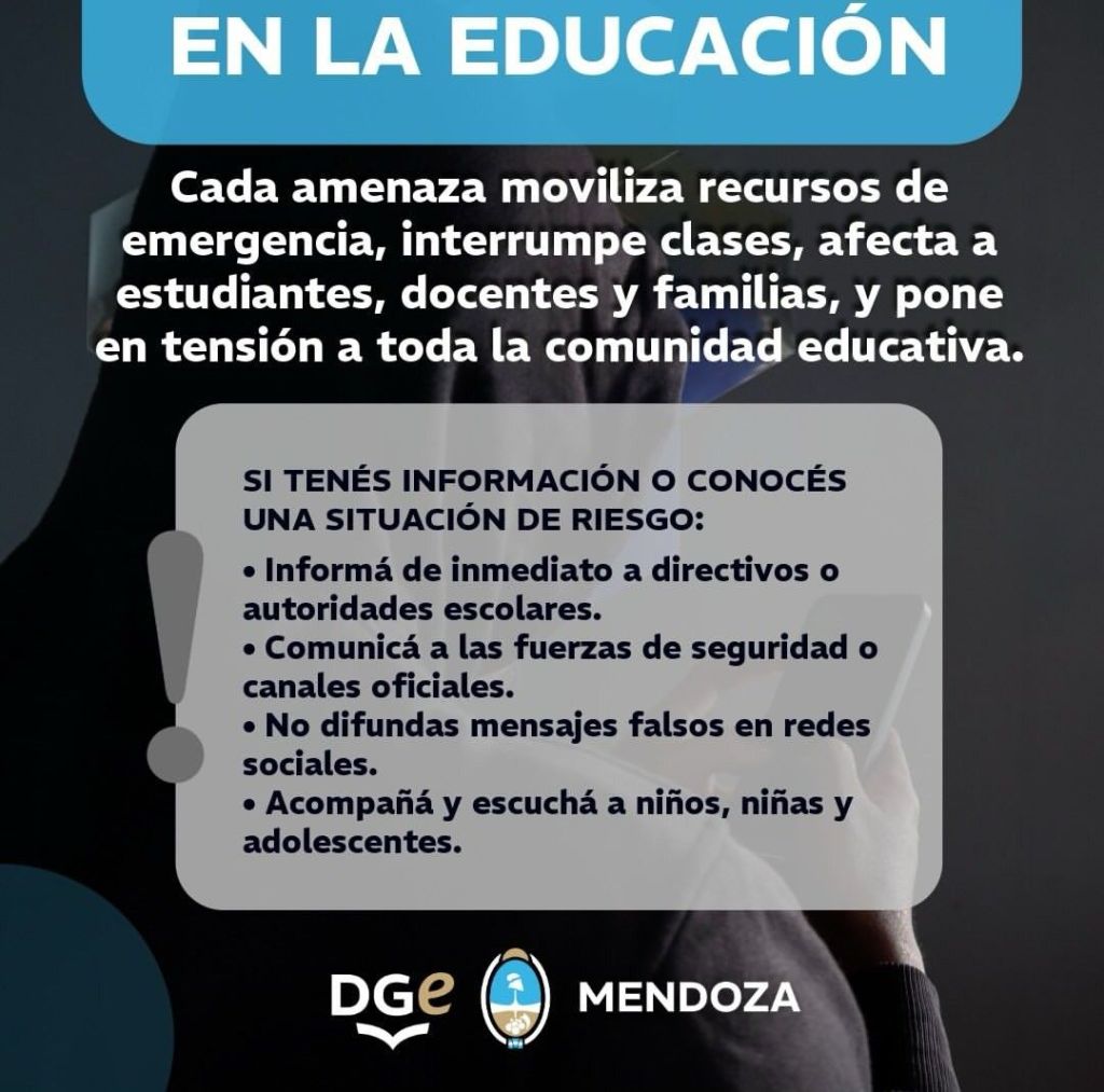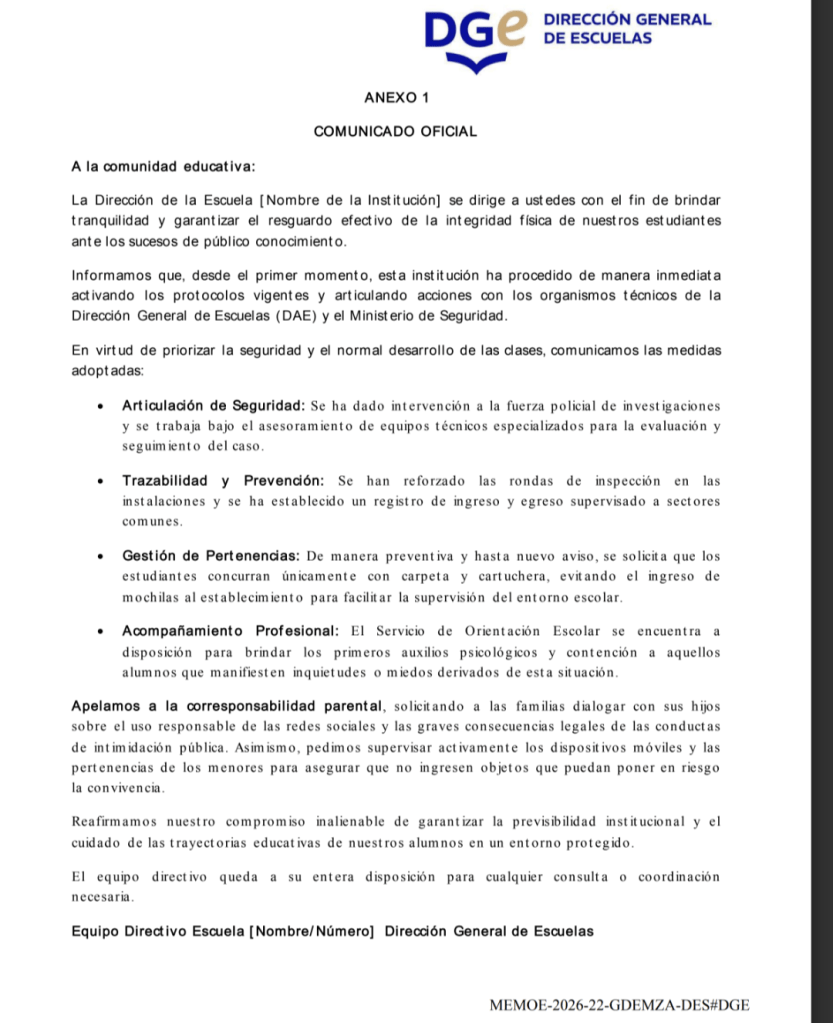 Frente a este escenario, la Dirección de Educación Secundaria de la Dirección General de Escuelas (DGE) emitió el Memorándum MEMOE-2026-22-GDEMZA-DES#DGE, que establece un protocolo de actuación específico para escuelas secundarias.