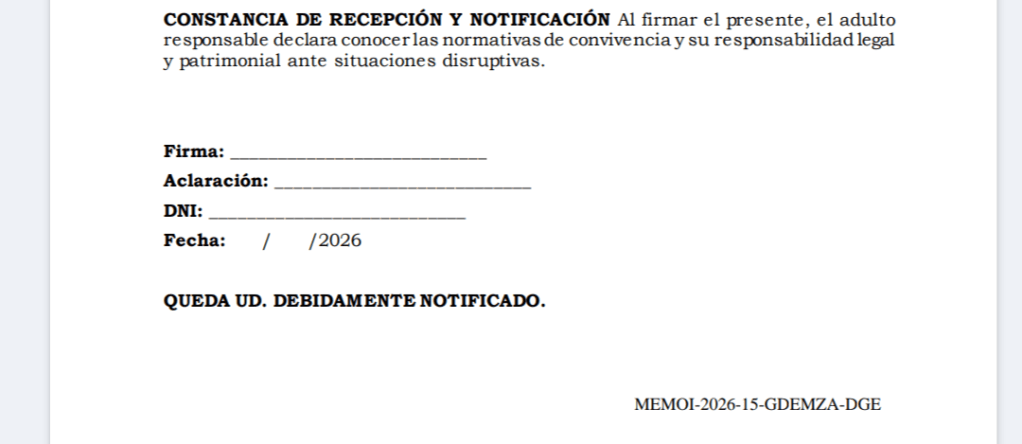 La notificación establece de manera explícita las responsabilidades de las familias, incluyendo aspectos vinculados al cuidado, la supervisión y las posibles consecuencias ante situaciones que afecten la convivencia escolar.