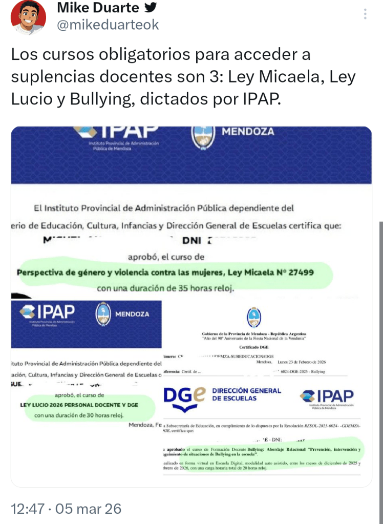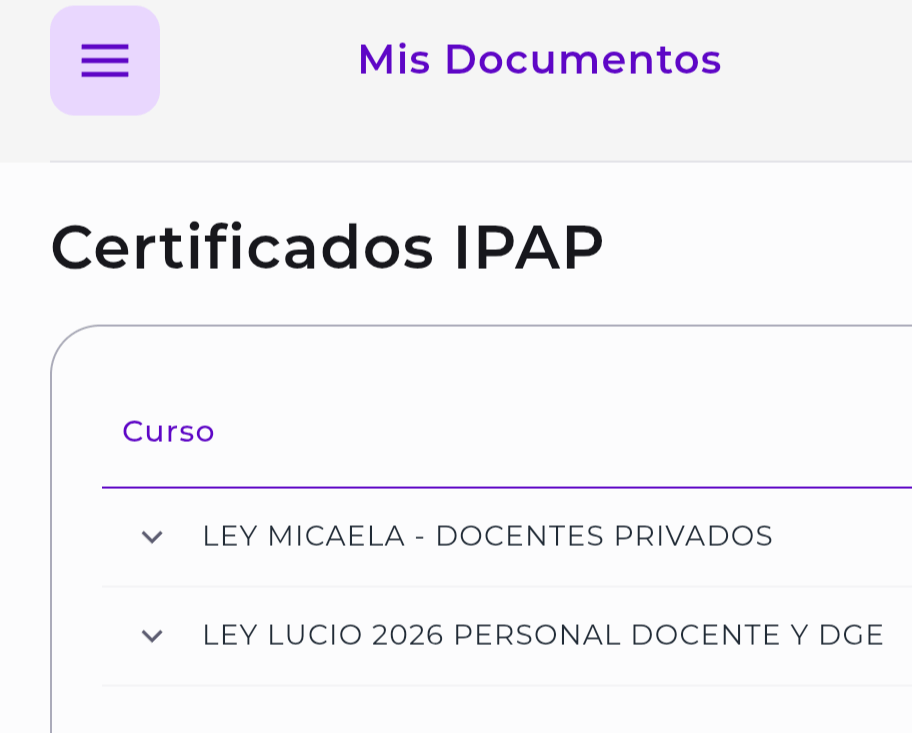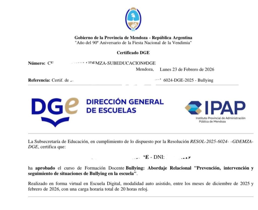 - En el caso de los certificados de Ley Micaela y Ley Lucio se pueden descargar al momento de finalizar el cursado desde la plataforma IPAP o de forma permanente desde la cuenta personal del docente en la plataforma Mendoza x Mí, en la sección «Certificado IPAP». En el caso del certificado de Bullying, se genera por tandas y se podrá descargar desde GEI PAD en la sección «Certificados».