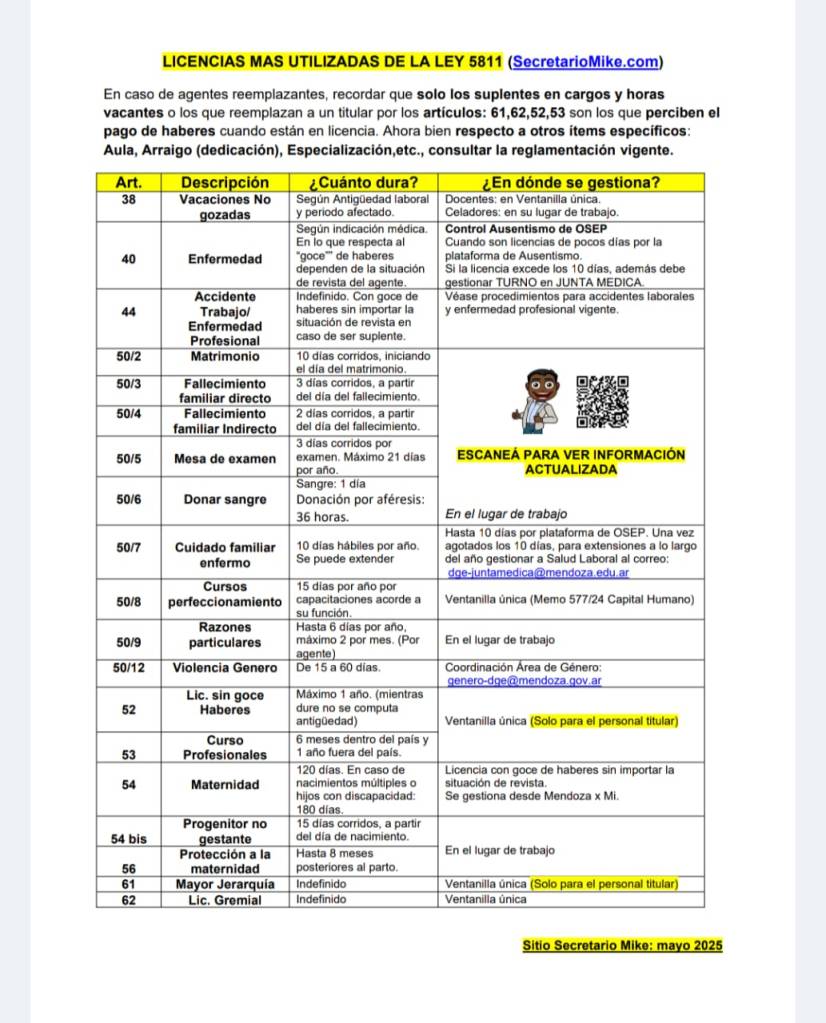Comparto con ustedes información relevante referida al régimen de licencias y franquicias para los trabajadores en el ámbito educativo de la Provincia de Mendoza, a medida que hayan actualizaciones serán incorporadas.